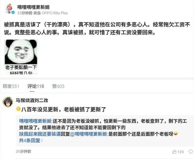 有意思的是,D站创始人被抓之后,停更半年多的微博账号"@嘀哩嘀哩更新姬"发文称:"被抓真是活该了(干的漂亮),真不知道他在公司有多恶心人。经常拖欠工资不说。竟整些恶心人的事。真该被抓,就可惜了还有工资没要回来。"