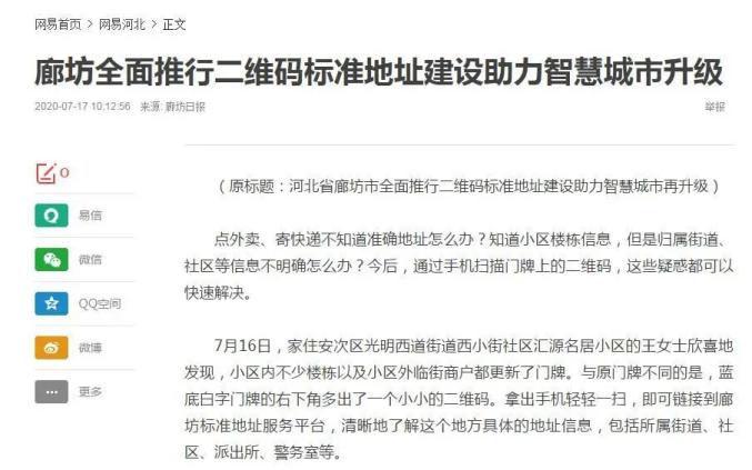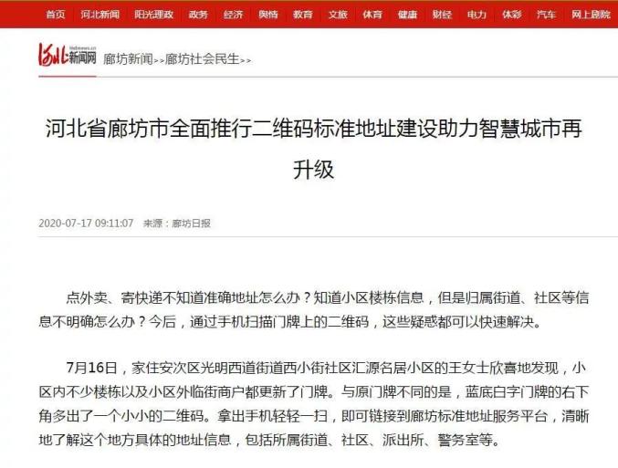 河北省廊坊市全面推行二维码标准地址建设助力智慧城市再升级