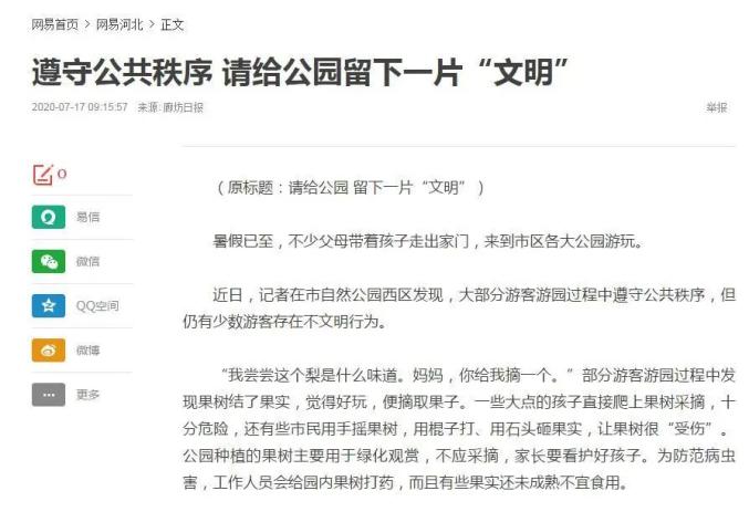 “我尝尝这个梨是什么味道。妈妈,你给我摘一个。”部分游客游园过程中发现果树结了果实,觉得好玩,便摘取果子。一些大点的孩子直接爬上果树采摘,十分危险,还有些市民用手摇果树,用棍子打、用石头砸果实,让果树很“受伤”。公园种植的果树主要用于绿化观赏,不应采摘,家长要看护好孩子。为防范病虫害,工作人员会给园内果树打药,而且有些果实还未成熟不宜食用。