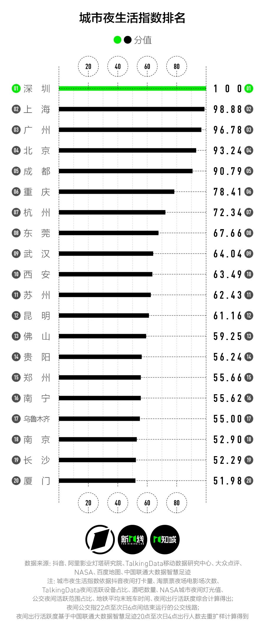 “知城·夜生活指数”想要衡量的是:不同的城市人在夜间的活跃程度,以及这座城市是否能给人们提供夜生活便利的条件。夜生活指数也反映了一个城市的夜间经济状况。