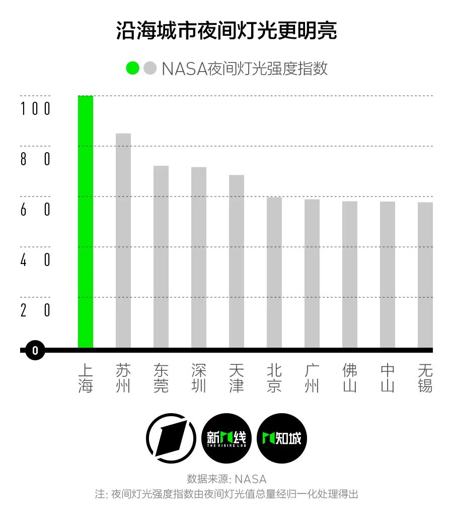 NASA的夜间灯光指数依然在这里被我们用来判断城市的夜间活力。夜间灯光值排名前15的城市均位于东部地区,且主要集中在长三角城市群和珠三角城市群。上海和苏州继续保持一、二名的领先优势,而广东省则有东莞、深圳、广州、佛山、中山五个城市进入前十。