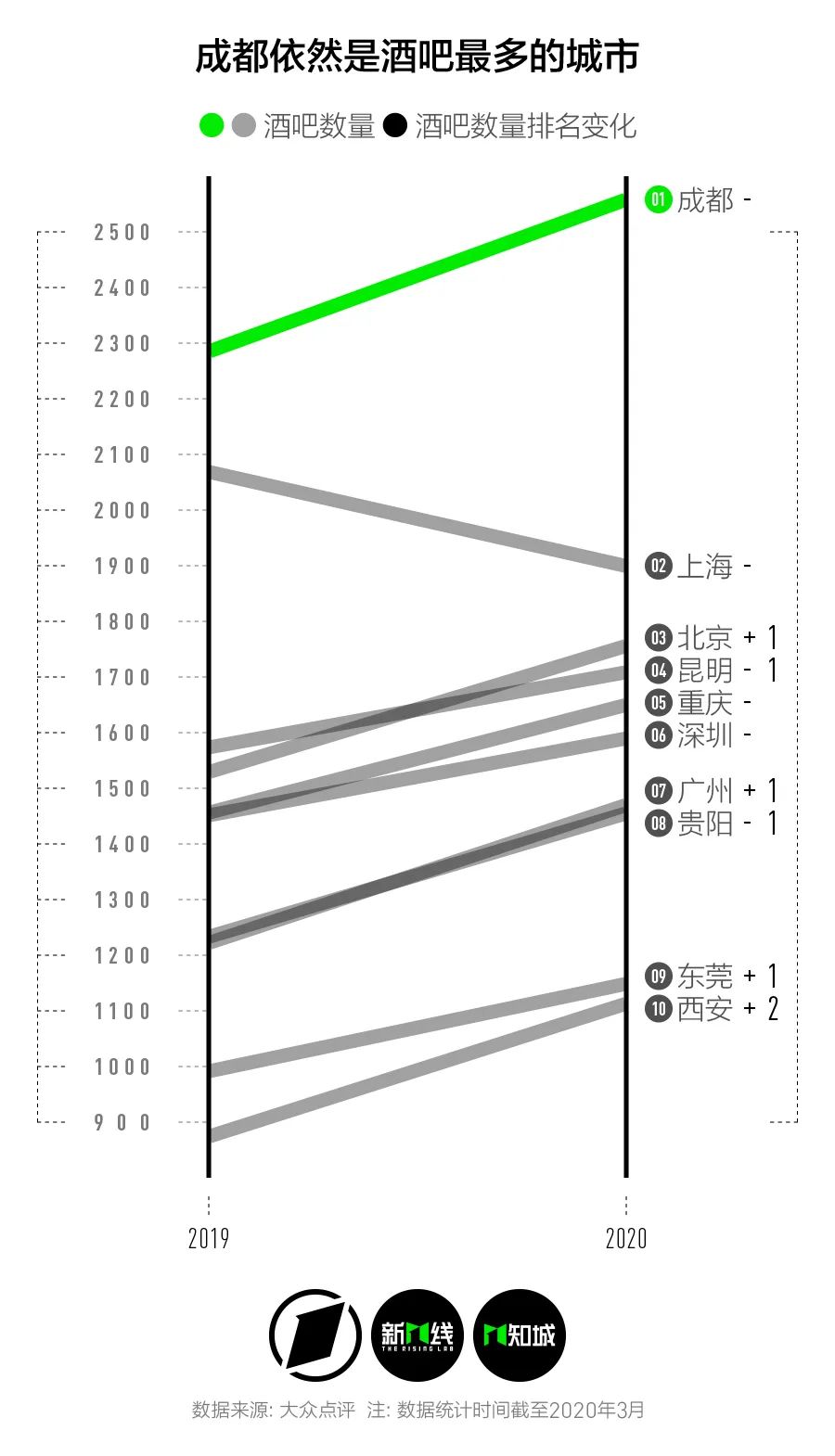 酒吧数量最多的成都,不仅总数比第二名上海多了641家,新增数量也是最多的,达到了255家。