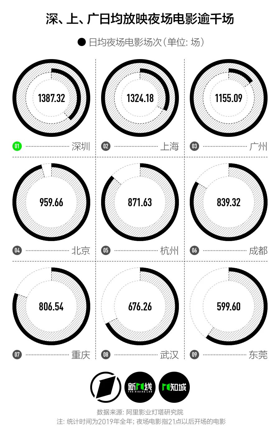 受疫情影响,2020年上半年电影行业受到重创,新一酱这里选取了2019年全年的数据,统计出不同城市夜场电影放映的场数。从每天晚上21点之后放映的场次数据来看,深圳、上海、广州每晚放映夜场电影都超过了1000场,其中深圳以日均1387.32场的数据继续稳居第一。