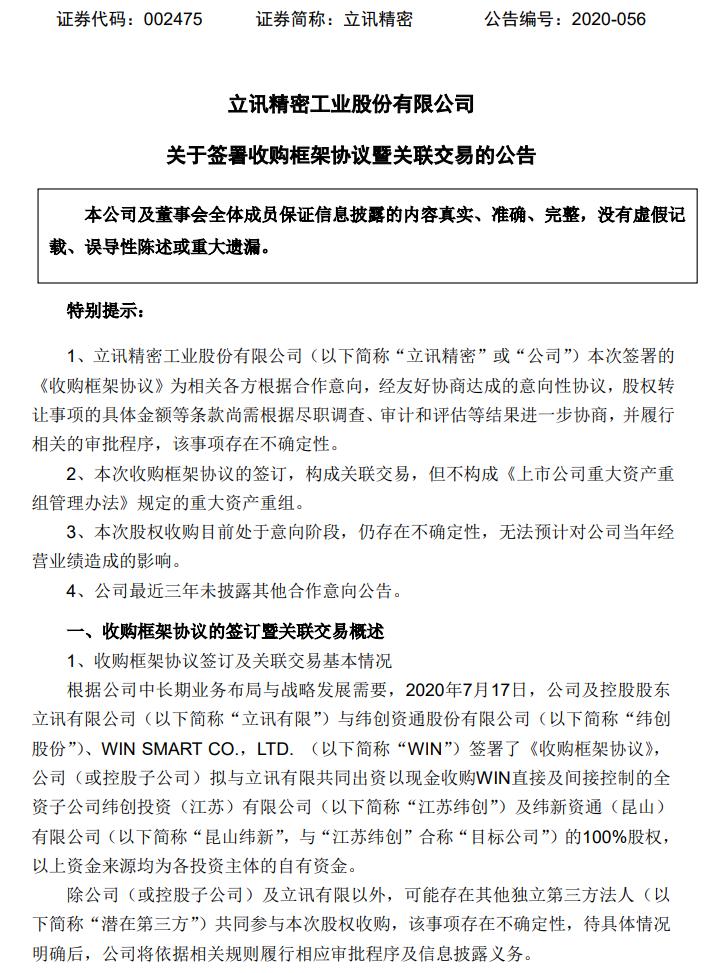17日晚间,A股上市公司立讯精密发布公告称,公司拟与控股股东立讯有限共同出资,以现金收购WIN直接及间接控制的全资子公司纬创投资(江苏)有限公司及纬新资通(昆山)有限公司100%股权。