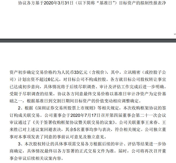 除公司及立讯有限外,可能存在其他潜在第三方共同参与此次收购。目标资产初步确定交易价约33亿元。立讯精密(或控股子公司)计划出资不超6亿元,对目标公司不构成控股。