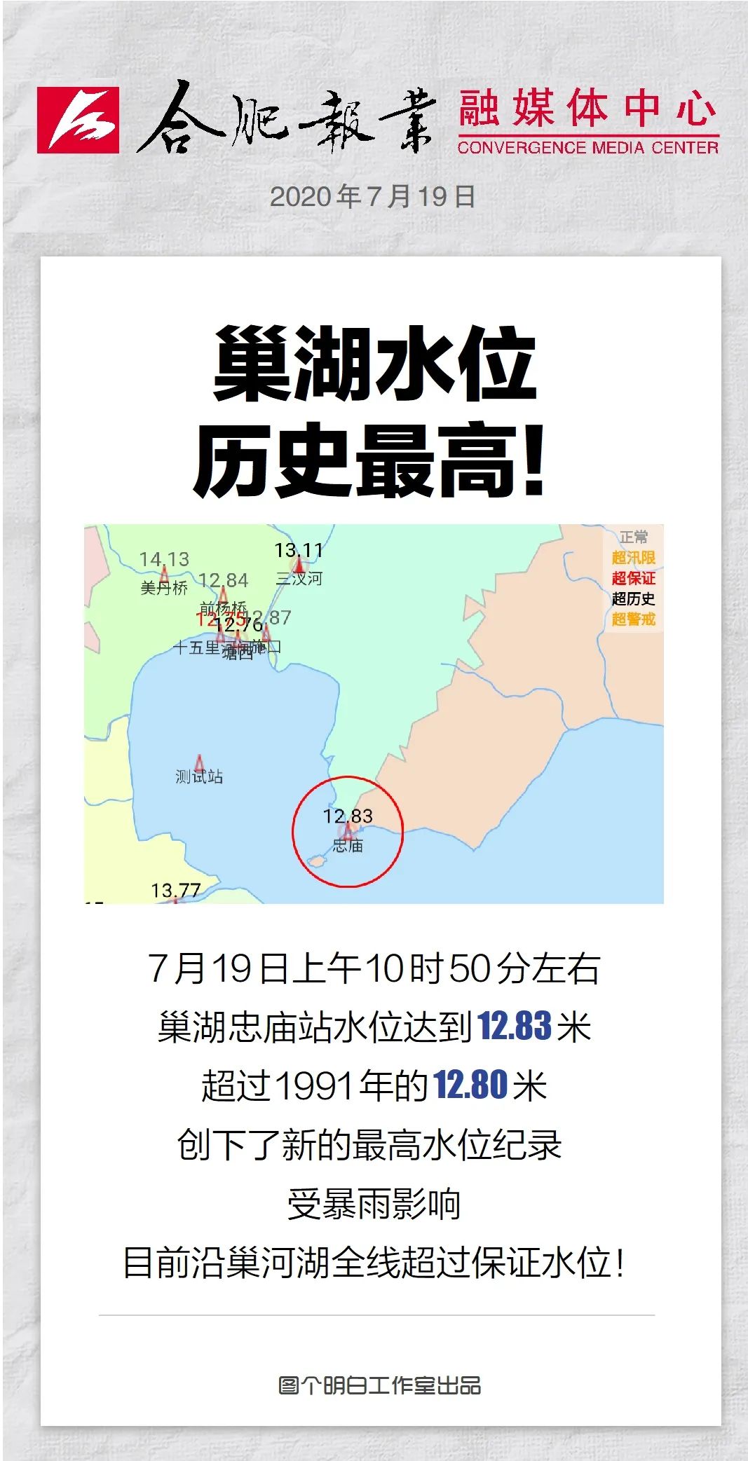 记者从合肥市水务局获悉,截至2020年7月19日上午10时50分左右,巢湖忠庙站水位达到12.83m,超过1991年历史最高纪录,创造了新的最高水位纪录。受暴雨影响,目前沿巢河湖全线超保。