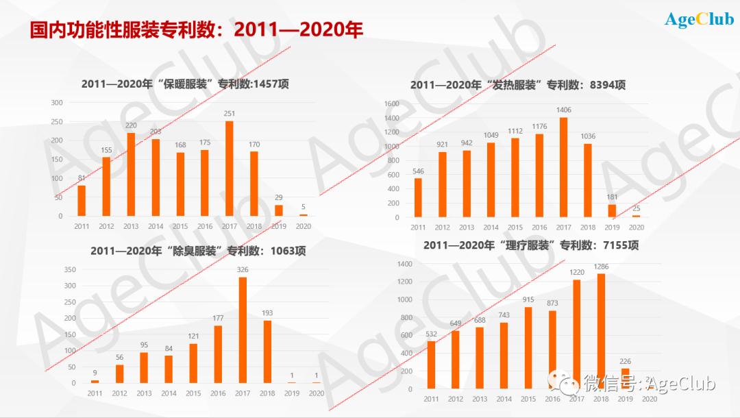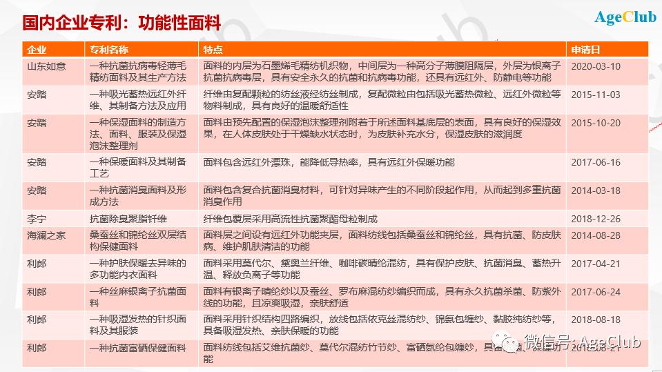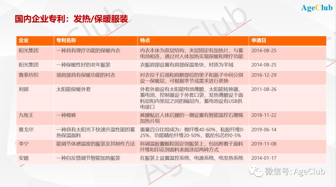 学术界不太受重视的“发热服装”,专利数却是最多,为8394项,而这也与AgeClub对电商平台消费品数据监测获得的发现相吻合。