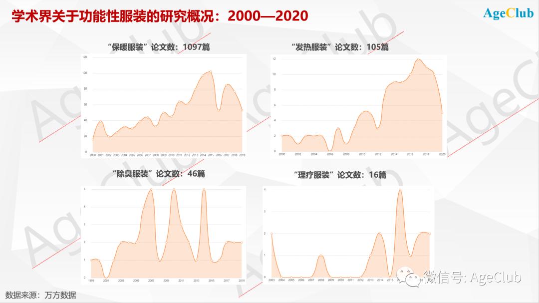 学术界在2000年以来对与老人相关的功能性服装做了大量研究,其中“保暖服装”的研究成果最多,论文数量为1097篇。相比之下,“发热服装”、“除臭服装”、“理疗服装”的论文数量就少很多,分别为105篇、46篇、16篇。