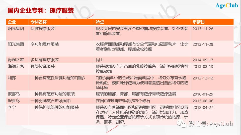 此外,还有一些企业提出了很多智能服装、理疗服装的专利。比如智能服装提供GPS定位、血压血糖等身体监测等功能。