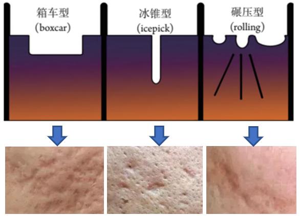 痘坑在医学上称为萎缩性瘢痕,长痘时皮肤受到的伤害越深,比如较重的炎症、挤压痘痘或治疗不及时,皮肤全层组织遭到破坏,留下的痘坑就会越明显。我们常见的痘坑基本分为三种:厢车型、冰锥型、和碾压型。
