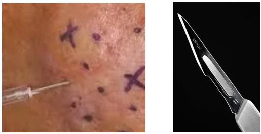 原理:前者是利用分离针分离皮肤与皮下组织的粘连,同时组织出血后机化形成纤维结缔组织填充凹陷的痤疮瘢痕。后者是对于局部的萎缩性痘坑较深较大者,直接手术切除后精细美容缝合的技术,对于操作医生要求较高。