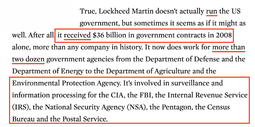 对洛马公司,美国《国家》杂志网站刊文称:“它并不是美国政府的掌门人,但有时它似乎可以掌控美国政府。仅在2008年,它就获得了360亿美元的政府合同,比历史上任何一家公司都多。现在,它为二十多个政府机构工作,从国防部、能源部、农业部到环境保护局。它还参与了中央情报局(CIA)、联邦调查局(FBI)、国税局(IRS)、国家安全局(NSA)、五角大楼、人口普查局和邮政总局的监控和信息处理工作。”