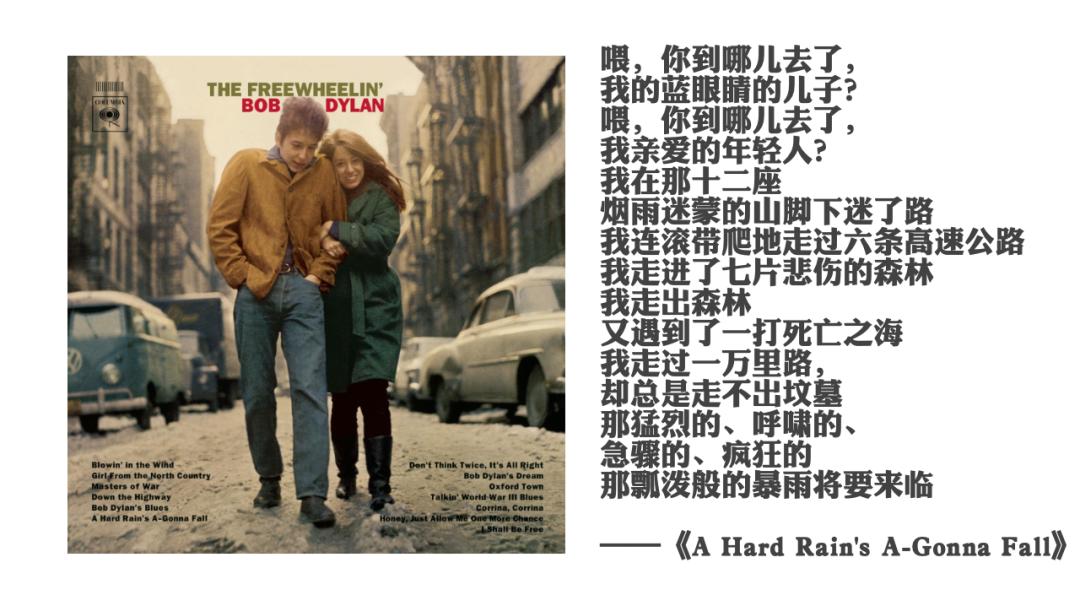 这首歌叫《暴雨将至》(A Hard Rain's A-Gonna Fall),跟《答案在风中飘》出自同一张专辑。但它比后者高了一个层次,《答案在风中飘》没给出答案,是虚晃一枪。迪伦找到了一个表达方式让听众觉得他似乎说了什么,实际上却什么都没说。《暴雨将至》就不一样了,这首歌的背景是1963年的古巴导弹危机。