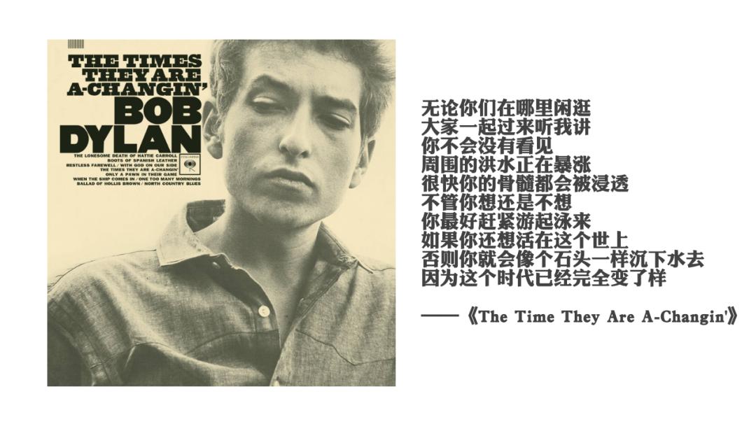 哥伦比亚唱片公司要给美国的年轻人推出新的偶像,这个人是青年一代的代言人,为这代人发声,鲍勃迪伦以这个人设开始出道。可以去《来自民间的叛逆》看看这首歌的歌词,也很直白。意思是你们老年人赶紧靠边站,这个时代是我们的。但仔细琢磨,这其实是一个普世价值,每个年代都这样。这是迪伦在这个风潮里高明的地方,他会写一些看似很造反很抗议的歌,实际上他的歌词非常普世。