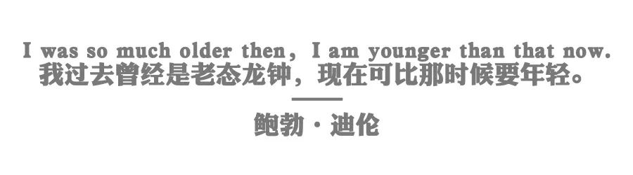 《答案在风中飘》里他前面列了好多的问题,答案在哪儿?答案在风中飘,听起来很深奥,但实际上就是一句俏皮话。老年人思维太陈旧,轮到年轻人上台。这个话在任何年代都可以说,迪伦其实写了一首万年抗议歌,这是他最聪明的地方。