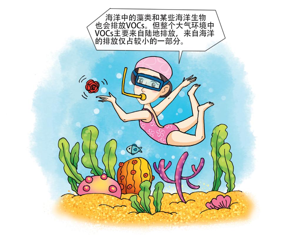 海洋中的藻类和某些海洋生物也会排放VOCs。但整个大气环境中VOCs主要来自陆地排放,来自海洋的排放仅占较小的一部分。而且海上空气较为洁净,NOx含量很低,所以生成的O3量很少。同时由于海洋人口密度非常低,所以对人产生的影响也非常少。