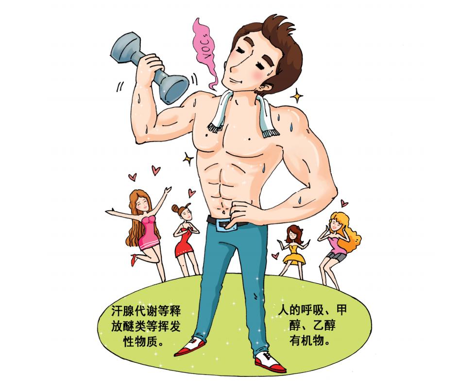 人的呼吸、汗腺代谢等释放甲醇、乙醇、醚类等挥发性有机物。此外,不同生理状态的人呼出的气体成分也不尽相同。目前,通过监测病人呼吸气体中的挥发性有机气体成分来进行病情诊断作为一种无创诊断技术甚至成为了生物医学工程领域研究的一个热点,例如己醛、庚醛、苯乙烯和癸烷等被作为肺癌呼吸气体监测的标志性气体成分。