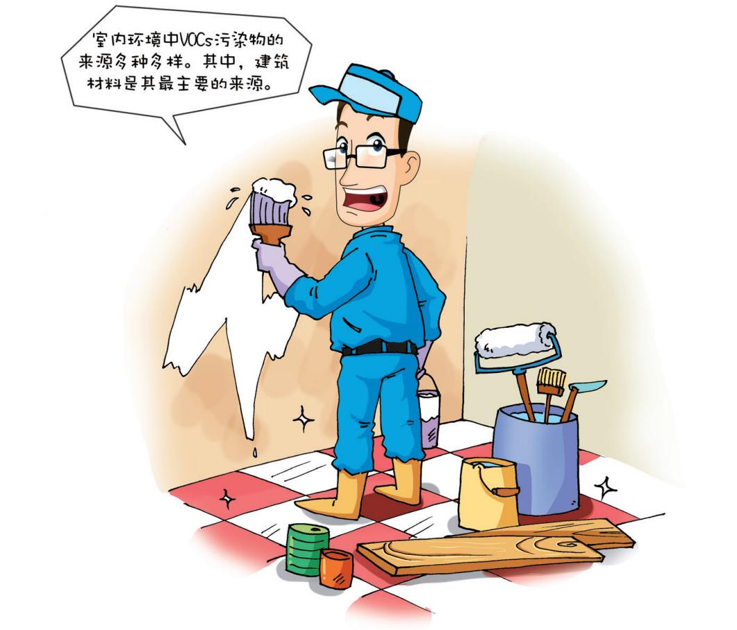 室内环境中VOCs污染物的来源多种多样。其中,建筑材料是其最主要的来源,除了地板之外,还包括敷设材料、颜料、油漆、黏结剂、木材防护剂、墙体和屋顶护层、密封剂、涂墙灰泥、砖块和混凝土等。此外,清洁剂、除臭剂、杀虫剂、化妆品的使用,厨房内家用燃料的燃烧(如天然气炉灶)、烹饪油烟,吸烟,打印机、复印机的使用,人的呼吸与代谢均会产生VOCs。总的来说,室内有关溶剂使用的物品,均可能是 VOCs的来源。
