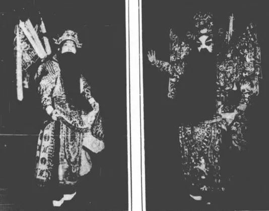 戏子自中幅入来,歌舞呈技,轮回出入,许多戏技,回回各异。或金冠彩帕,锦袍罗衫,手持金莲、灵芝、蟠桃,且歌且舞,皆是祝寿也。或有女子盛妆,随男子而出,叙话说情,若茶肆、酒楼、洞房会合离别之状,其状不一,其形殊诡,而不能解其词曲言语,未知演出何样小说。或有王者,具冕服,旒衮伞扇,仪仗俨若帝王,对坐交椅,呼唱几回而罢。或有佛子,具袈裟、香烛,诵梵呗,对坐于层层椅子而罢。或有手持彩方扇,合则为一,展而为二,外面书寿福禄,内面书六甲,自甲子至癸亥,盘旋周面,诵祷而出,此是《万年甲子》也。