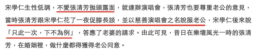 在生完两个孩子之后,偶尔张清芳出来接受媒体采访时就会在节目中有意无意中透露的生活,她从一代歌后变成了二十四孝老婆。