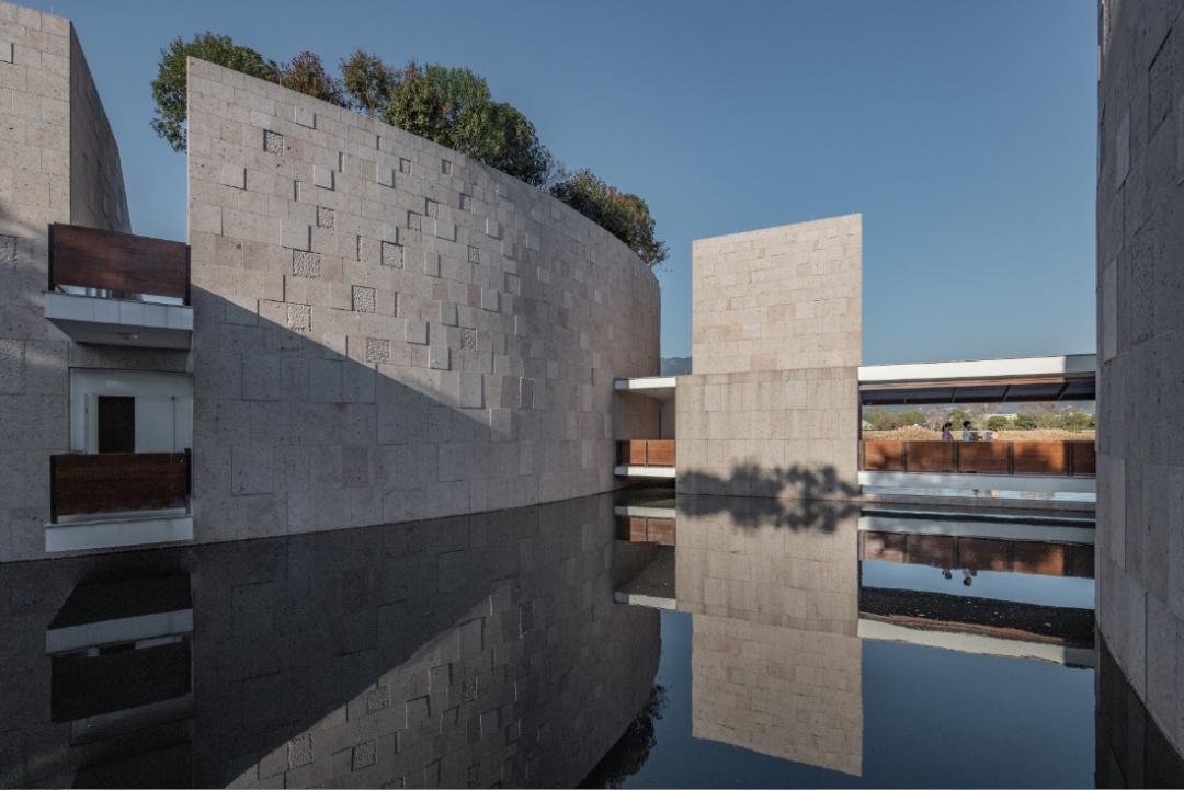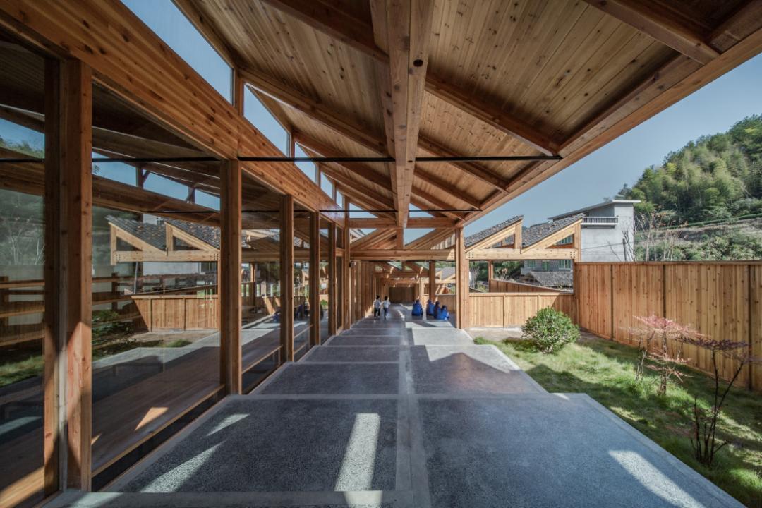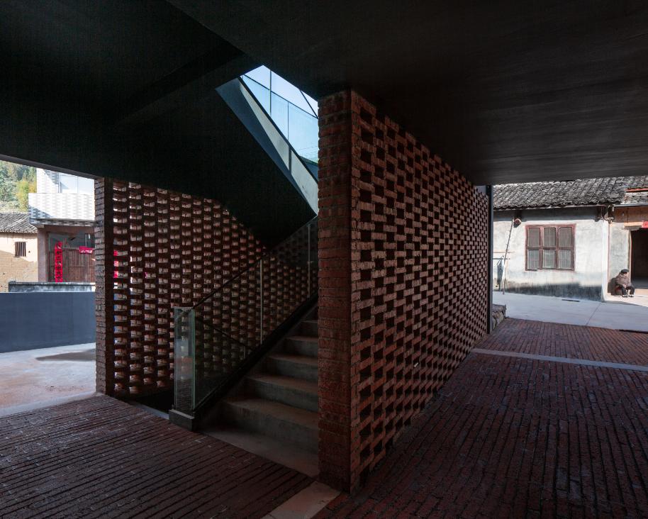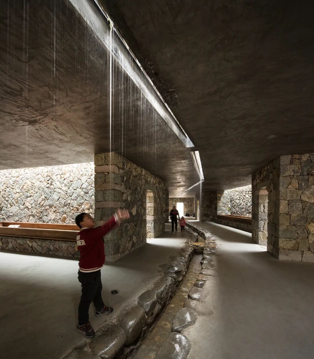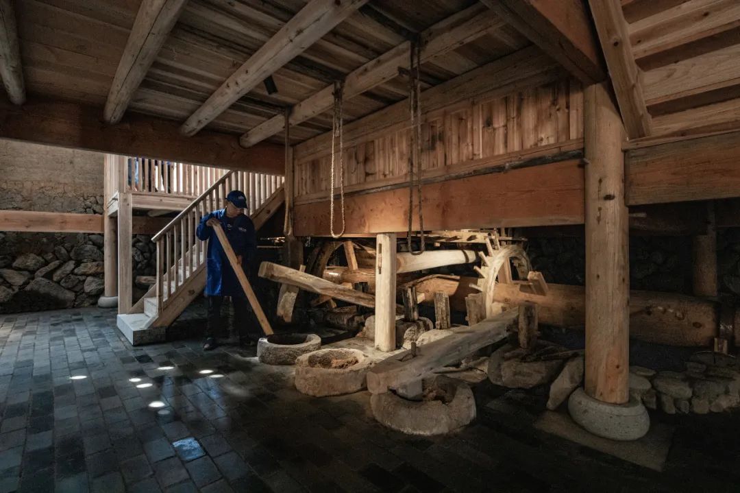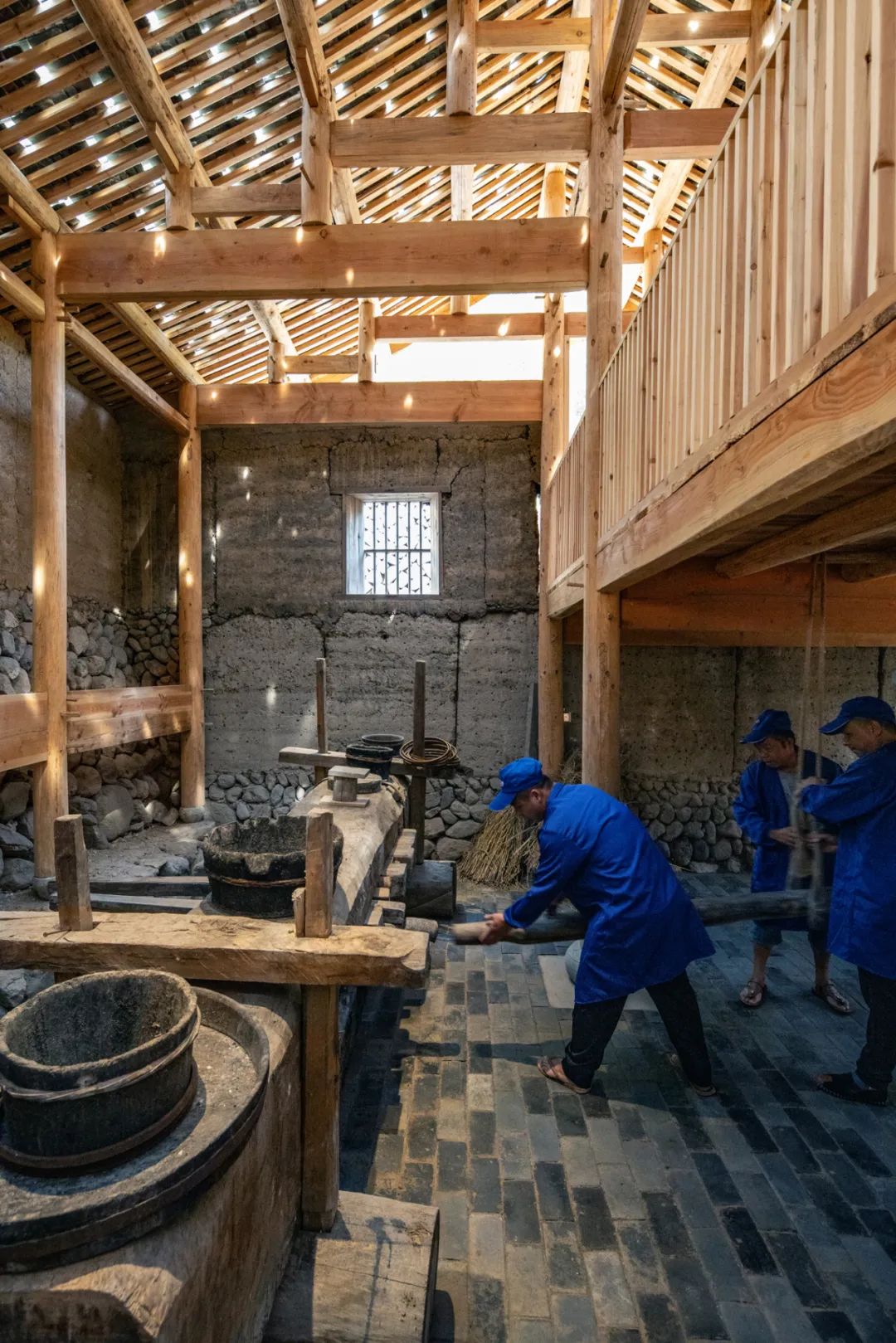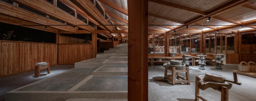 在老水滩作坊的基础上改造而成,保留了主楼和内部的木制机械,新增加的部分是传统的“榫卯”木结构配以砖墙包裹,形成了一个有梯田和小溪的连续景观,为这个传统村庄注入了新的活力。