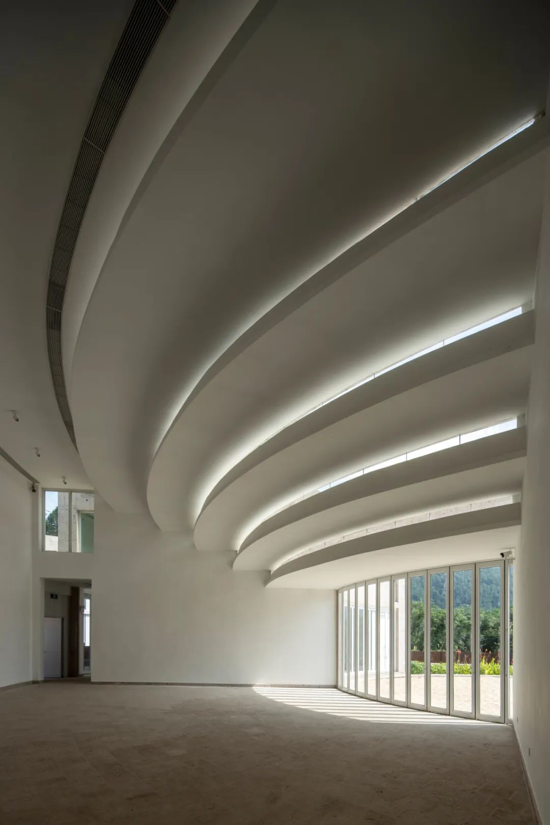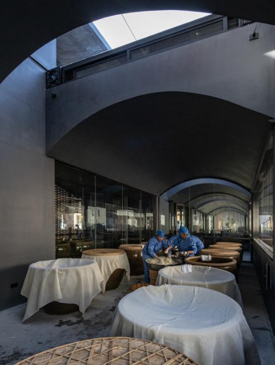 建筑随地形变化呈不规则梯形布局,为现浇清水混凝土拱顶式框架结构。建筑中多数空间利用自然采光,隐秘而又通透。既是白老酒生产的标准化示范工坊,也是传承、展示白老酒酿制技艺和酒文化交流的多元空间。