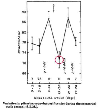 研究发现,女性在月经周期的第15天到第20天之间,毛囊皮脂腺导管口是最小的。