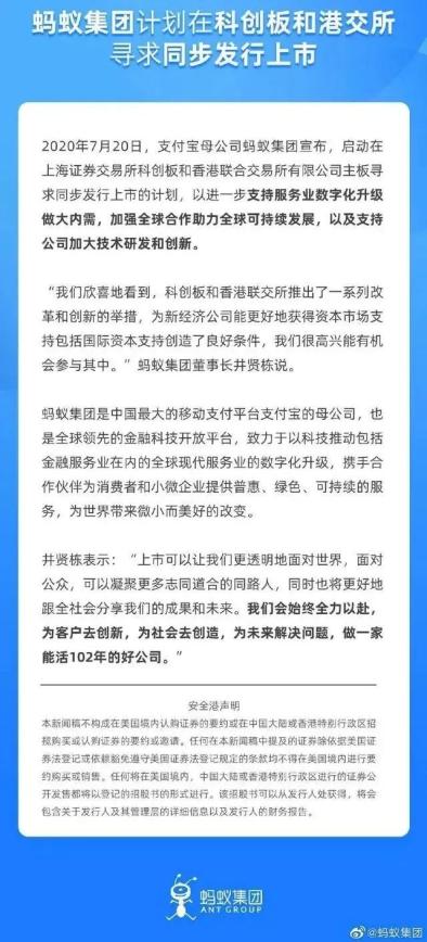 7月20日,支付宝母公司蚂蚁集团宣布,启动在上海证券交易所科创板和香港联合交易所有限公司主板寻求同步发行上市的计划,以进一步支持服务业数字化升级做大内需,加强全球合作助力全球可持续发展,以及支持公司加大技术研发和创新。