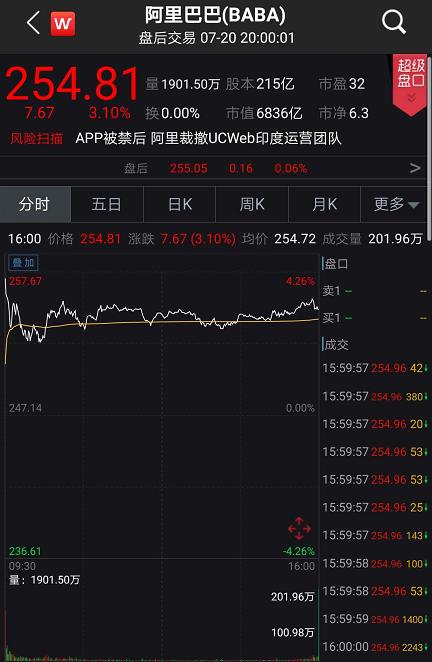 7月20日晚间,阿里巴巴在美股大涨超6%,截至当日收盘,阿里巴巴涨超3%。