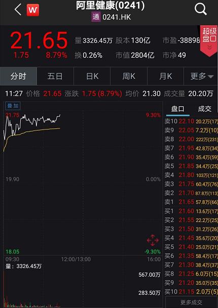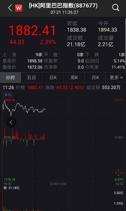 7月21日早间,阿里系股票果然集体狂欢。当天上午,阿里巴巴港股开盘跳涨超6%,市值增加超300亿。同时,A股市场和港股市场蚂蚁金服概念指数、阿里巴巴指数等集体掀起了涨停潮,涨幅最猛的港股中国动向早盘一度猛飙超20%。