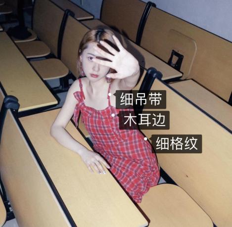 细肩带、抽绳这种细节一定要有,营造出一种柔弱但爱笑的伪坚强氛围。小范围的褶皱和木耳边这种看似不经意的点缀,能够充分的打造无辜感。