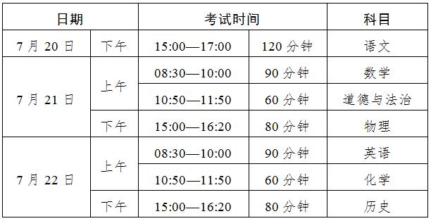 其中,数学、英语科目的考试时长从100分钟缩短为90分钟;化学、道德与法治从80分钟缩短为60分钟;历史从50分钟改为80分钟;语文、物理的考试时长不变。