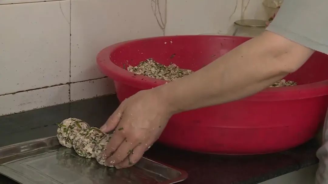 随后要准备的就是馅料了,为确保能擀出薄而大的麦饼,馅料就要尽量做得细腻一些,不论是南瓜、土豆还是苦麻等材料,都需要被刨丝或者剁碎,再将老豆腐用手捏碎与其混在一起,团成一个个圆圆的馅料。潘海英说,像我们浦江麦饼的馅,跟其他地方也是有区别的,因为浦江麦饼馅中都会加豆腐,豆腐可以增加它的柔软度,还有营养价值也比较高。