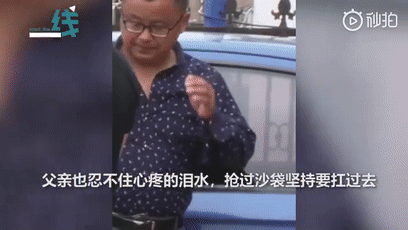 父亲一把抢过儿子面前的沙袋