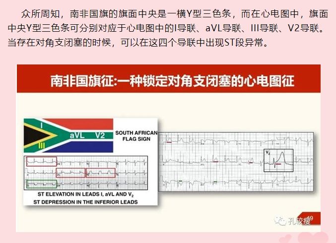 众所周知,南非国旗的旗面中央是一横Y型三色条,而在心电图中,旗面中央Y型三色条可分别对应于心电图中的I导联、aVL导联、III导联、V2导联。当存在对角支闭塞的时候,可以在这四个导联中出现ST段异常。