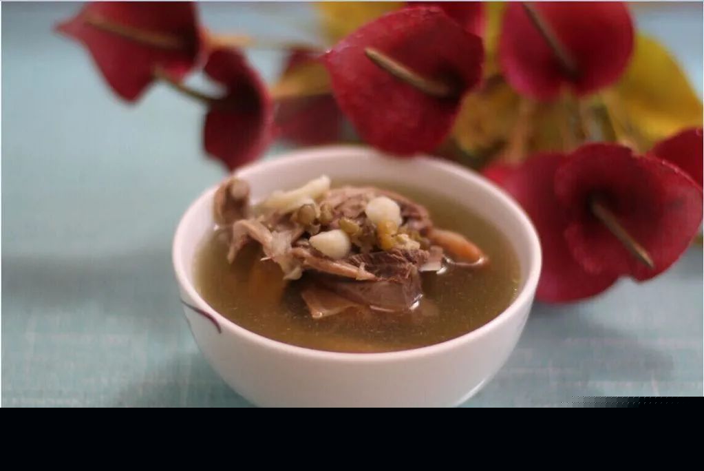 绿豆30克、百合15克、花旗参10克、白鸽1只