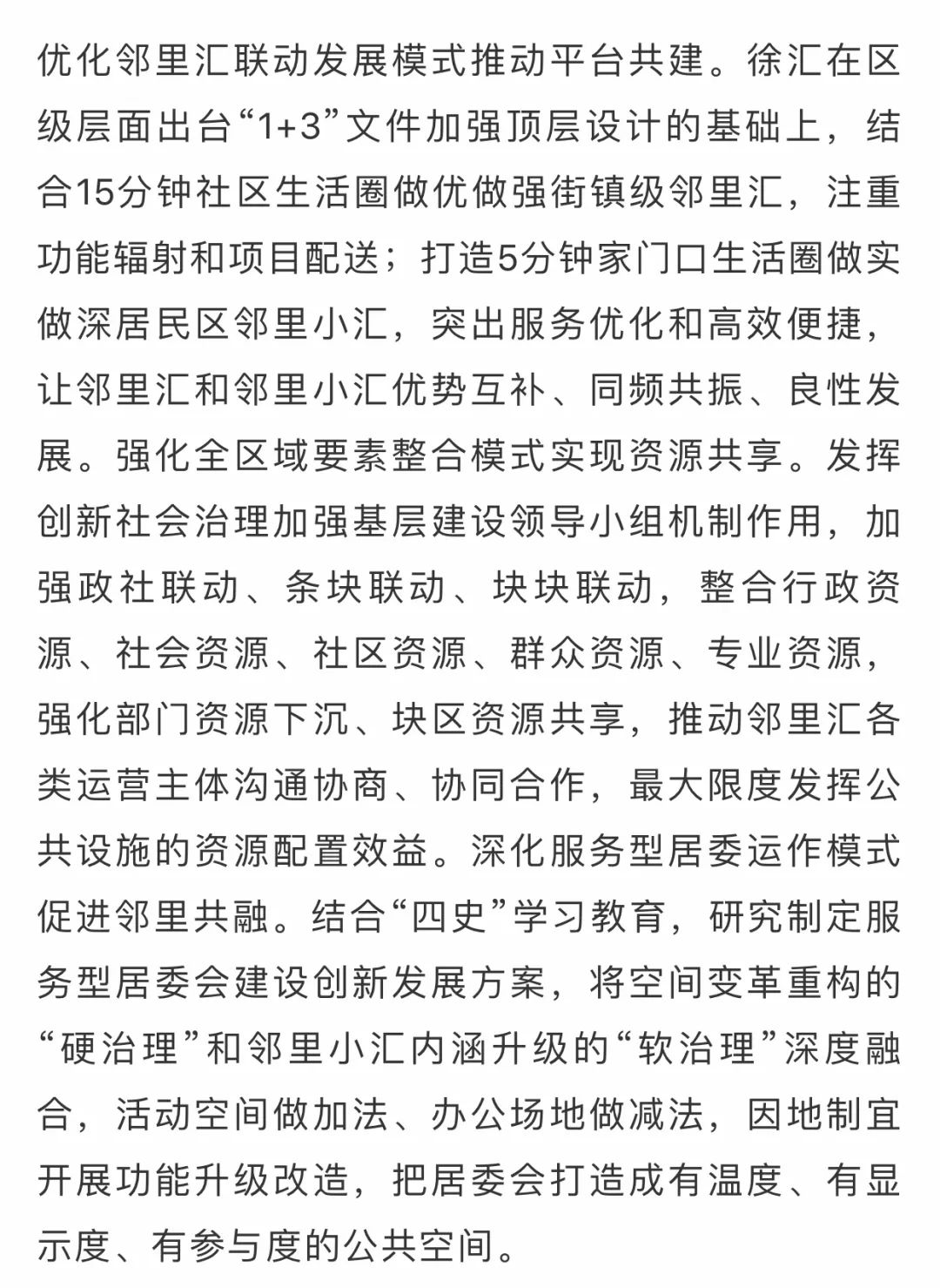 今年6月召开的市委全会上,徐汇“邻里汇”被写入了《关于深入贯彻落实“人民城市人民建,人民城市为人民”重要理念,谱写新时代人民城市新篇章的意见》。站在新起点,徐汇将奋发有为,持续用力,久久为功,把邻里汇纳入十四五规划的总体框架深耕打造,成为彰显“人民城市”内涵的新地标。