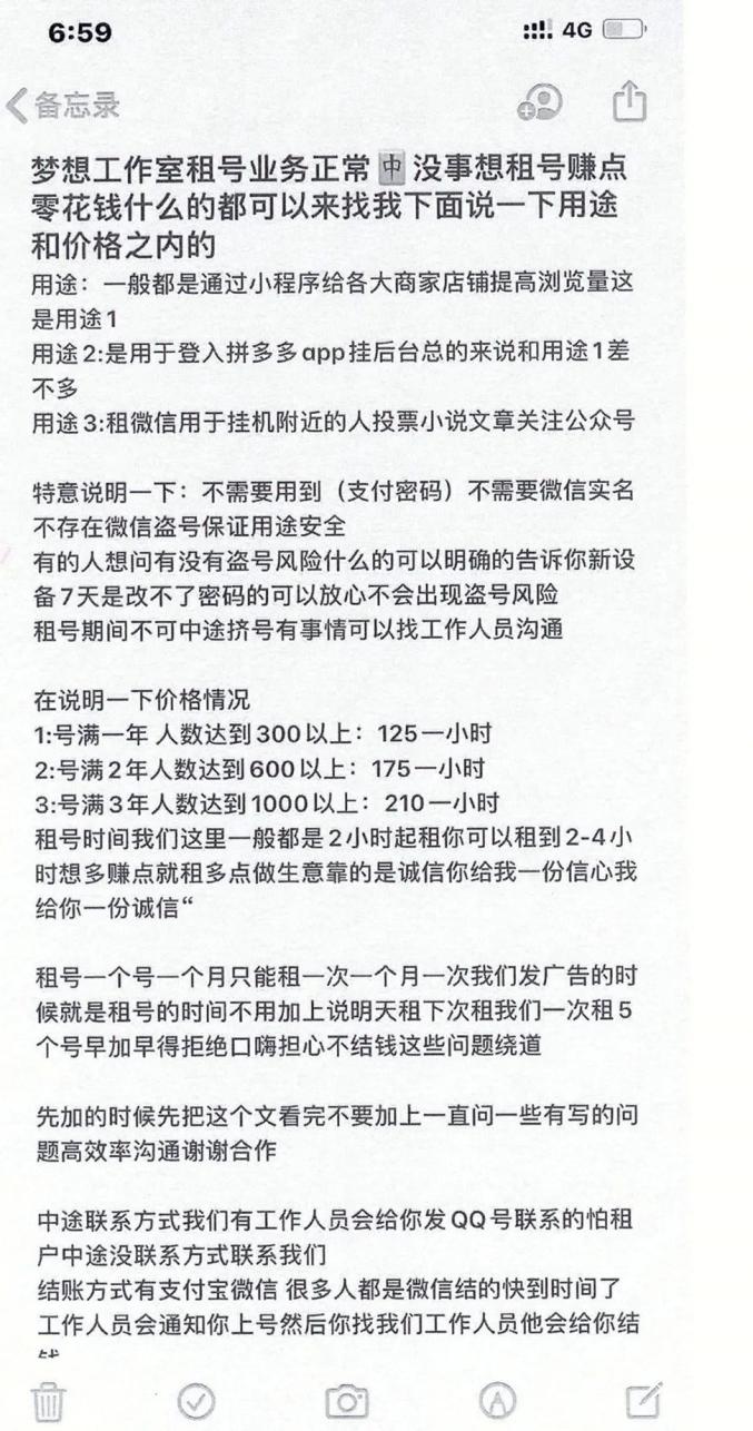 有“租号”需求的不是违法犯罪团伙,就是想打“擦边球”的灰产组织。他们在网上发布虚假广告,美其名曰是“短期租借”,其实就是变相盗号,哄骗用户自己交出账号、密码,再理所当然地将这些账号挪作他用。