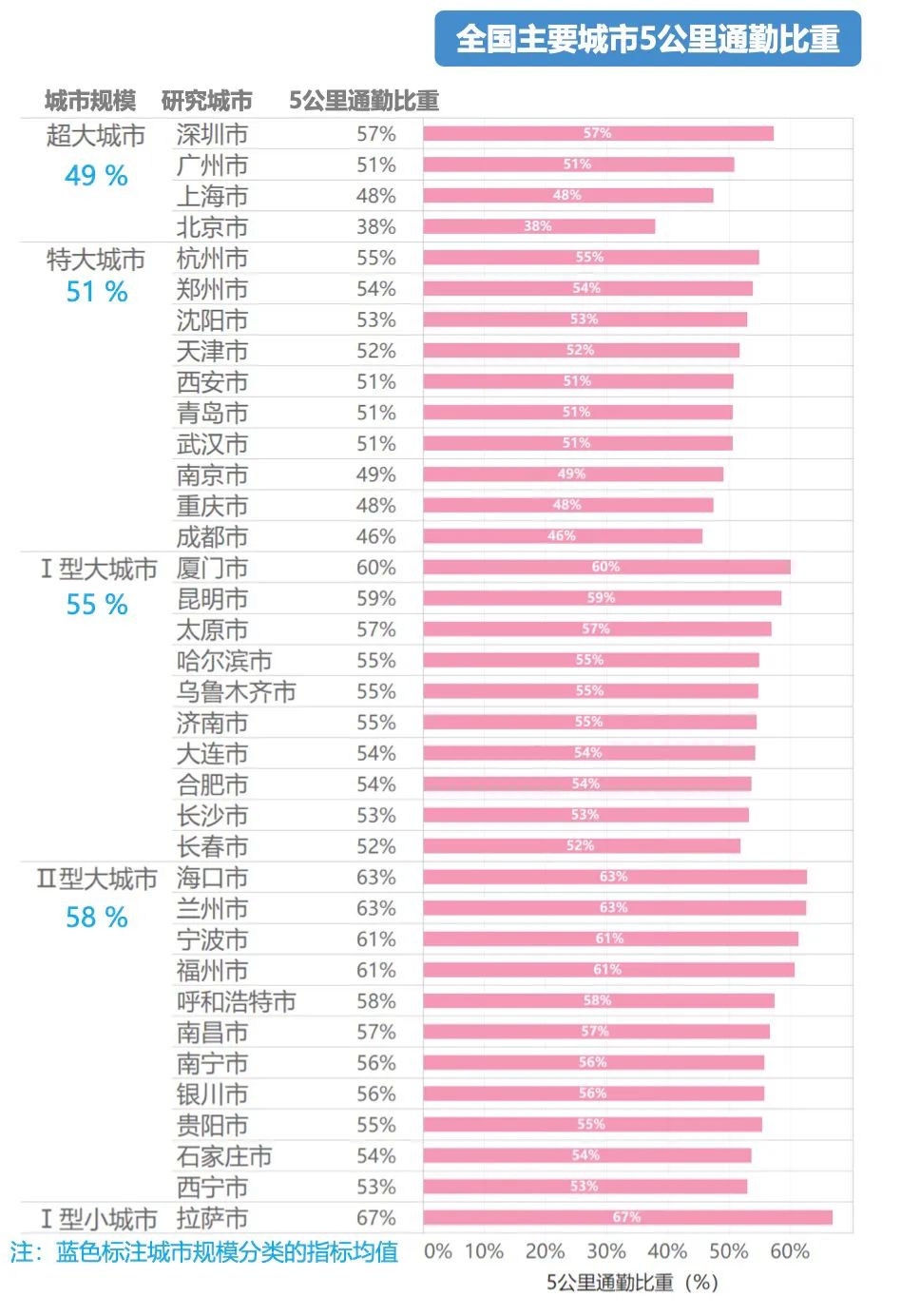 以下是36个城市“5公里通勤比重”的排行榜:
