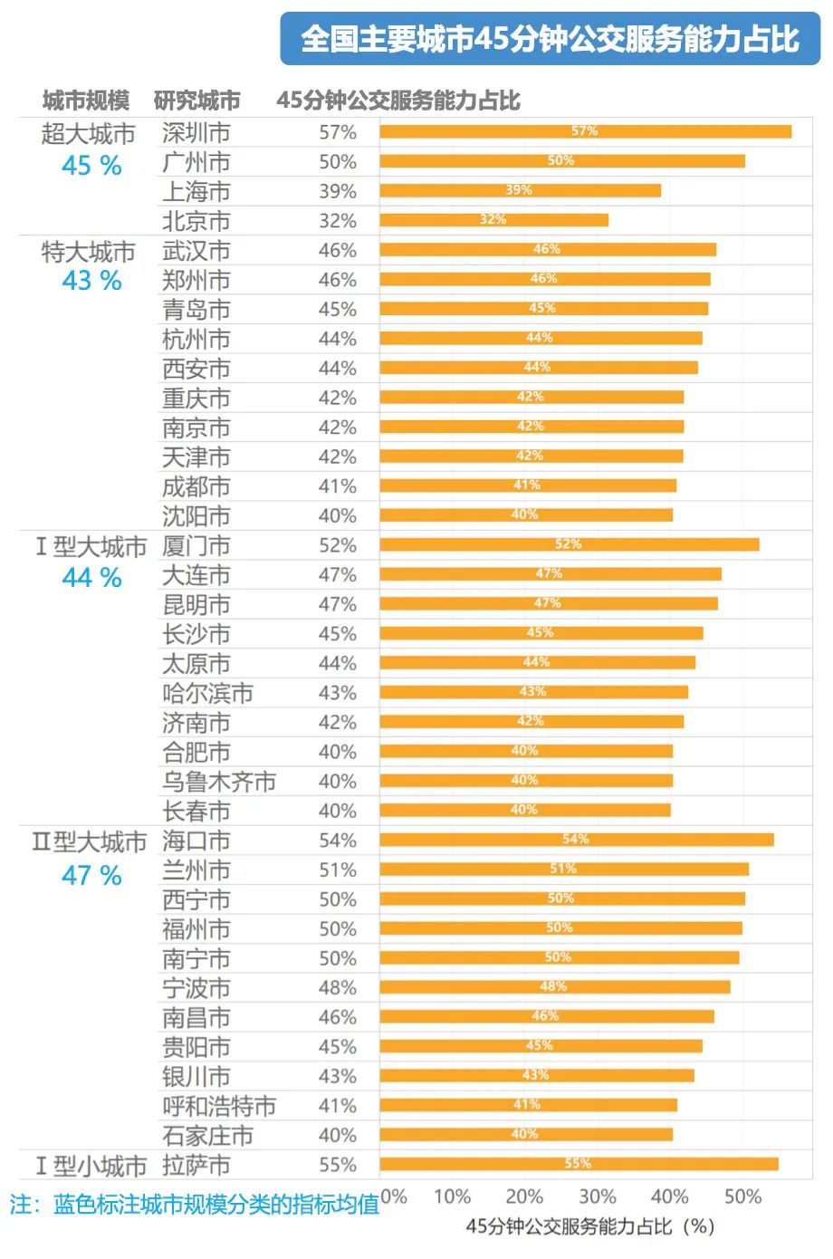 特大城市中,“45分钟公交服务能力占比”最高的是武汉,达到46%,最低的是沈阳,只有40%