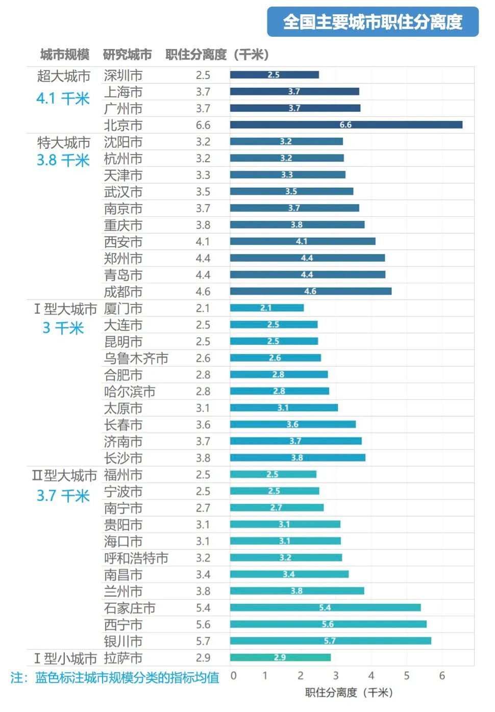 特大城市中,职住分离度最低的是杭州和沈阳,理论最小通勤距离为3.2公里。职住分离度最高的是成都,达到4.6公里。