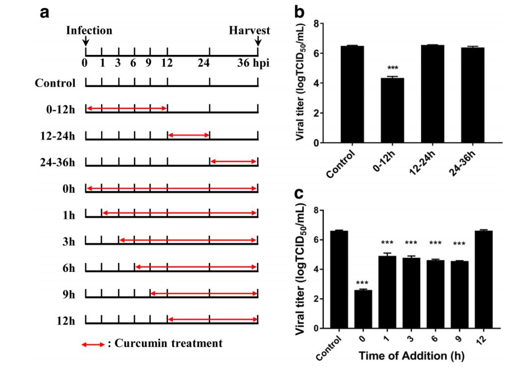“我们的研究证明姜黄素对TGEV具有抑制作用,这表明姜黄素可能是有效控制TGEV感染的候选药物,”对此,文章的第一作者Lilan Xie博士说道:“目前无疫苗病毒疾病的防控难度很大,而中药及其有效成分具有获取方便、副作用小等优点,是抗病毒药物的理想筛选库。”