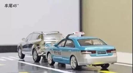 拍摄图片包括车头45°、车尾45°、两车道路位置示意图、碰撞示意图以及两车碰撞细节和号牌。