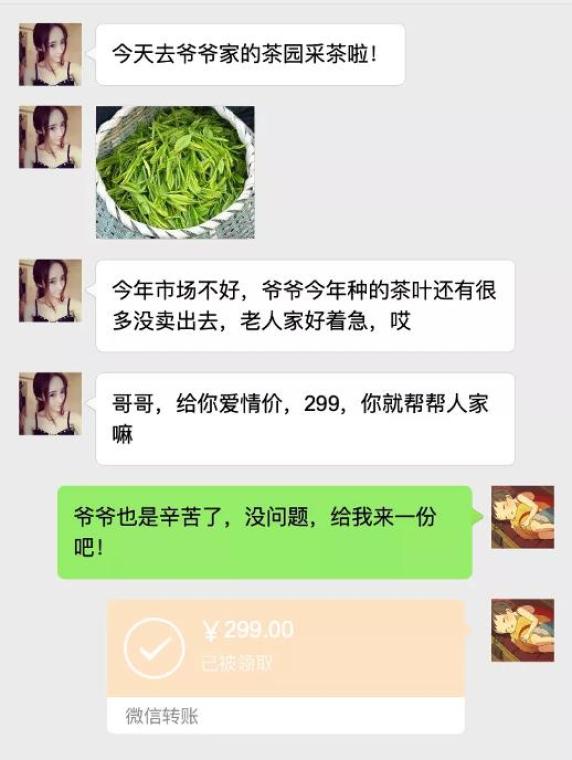 在“朋友圈诈骗江湖”里,也许你还听过“卖茶女”的传说。这一群“集才华与美貌于一身”的女子,头像总是清纯漂亮的照片,也经常在朋友圈晒爷爷家的茶园。她们拥有一股神奇“魔力”,能让男同胞心甘情愿“掏钱”。