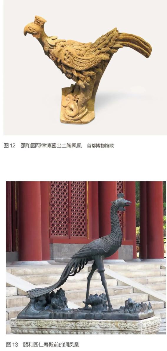 2.颐和园仁寿殿前的铜凤凰〔图13〕。前者像鸡,后者像孔雀。
