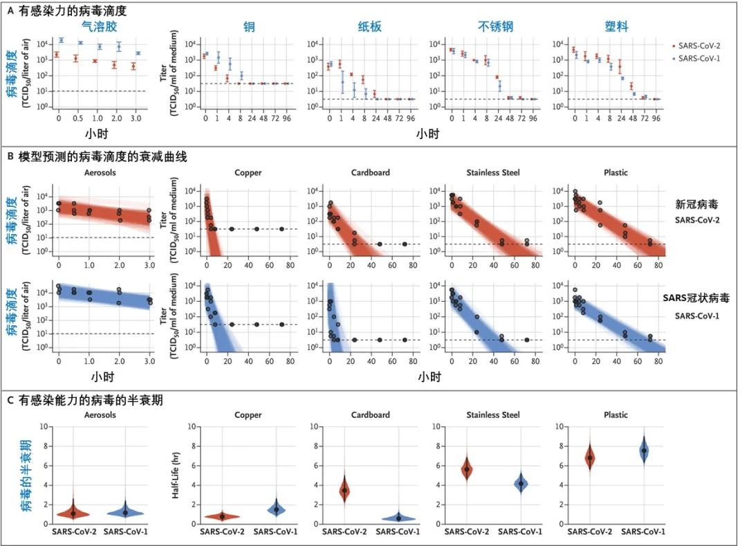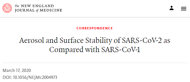 2020年3月17日,《新英格兰医学杂志》(The New England Journal of Medicine)发表了一篇来自美国科学家的通讯 (Correspondence),研究了新冠病毒 (SARS-CoV-2) 在气溶胶中和在各种环境表面的存活时间,并与SARS冠状病毒 (SARS-CoV-1) 相比较[1],还用贝叶斯回归模型估算了病毒活性的衰减速度。