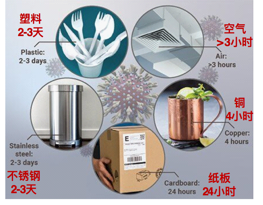 新冠病毒在不同环境表面的稳定性排名是:塑料 > 不锈钢 > 纸板 > 铜表面。
