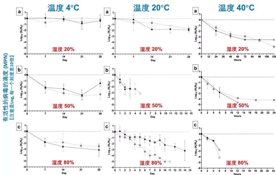 在40°C,病毒失活更快了。湿度越高,失活越快。