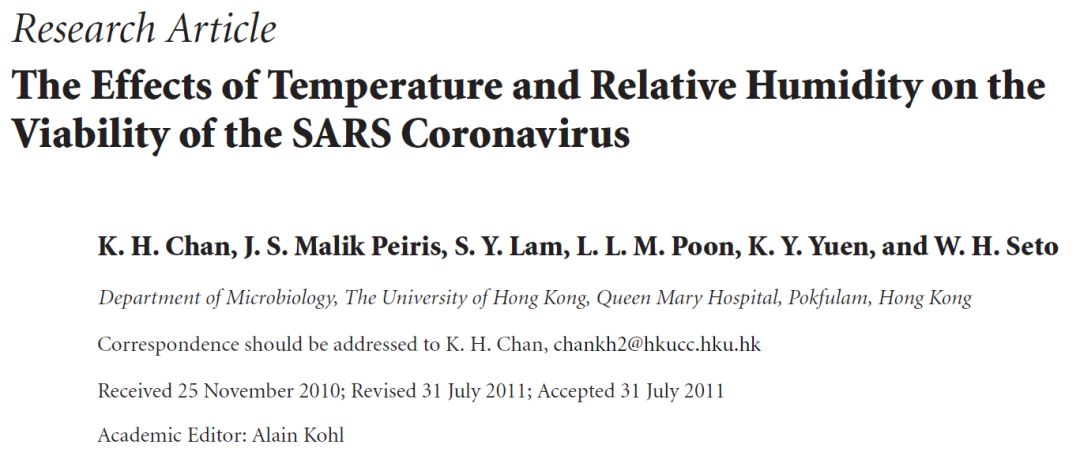 [8] K. H. Chan et al., The Effects of Temperature and Relative Humidity on the Viability of the SARS Coronavirus. Adv Virol 2011, 734690 (2011).