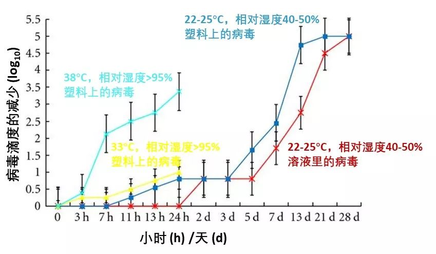 另一个新的研究,用的病毒起始滴度较高,结果也类似[2],在室温(22°C)、相对湿度约为65%的环境下: